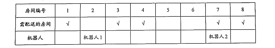例如,根据系统依次采集到的数据,当前需要配送的5个房间编号分别为1,8,3,4,7, 假如可提供配送服务的机器人1、机器人2分别处在房间2、房间7,如下图所示。